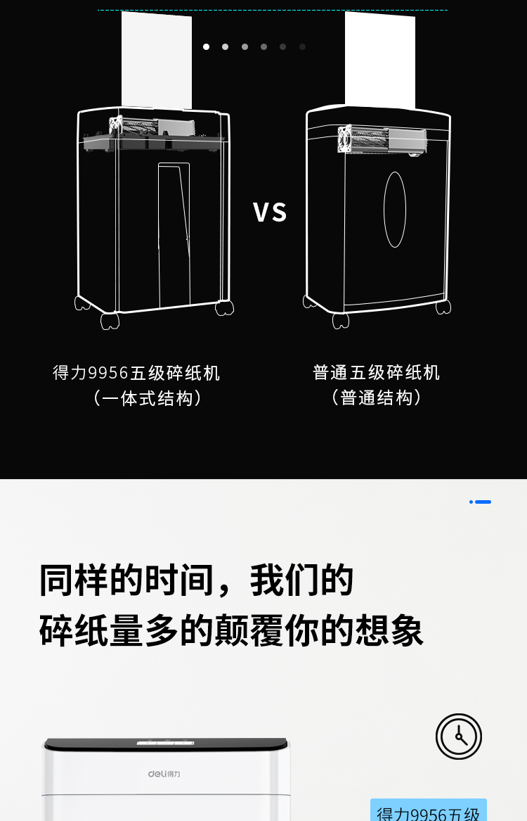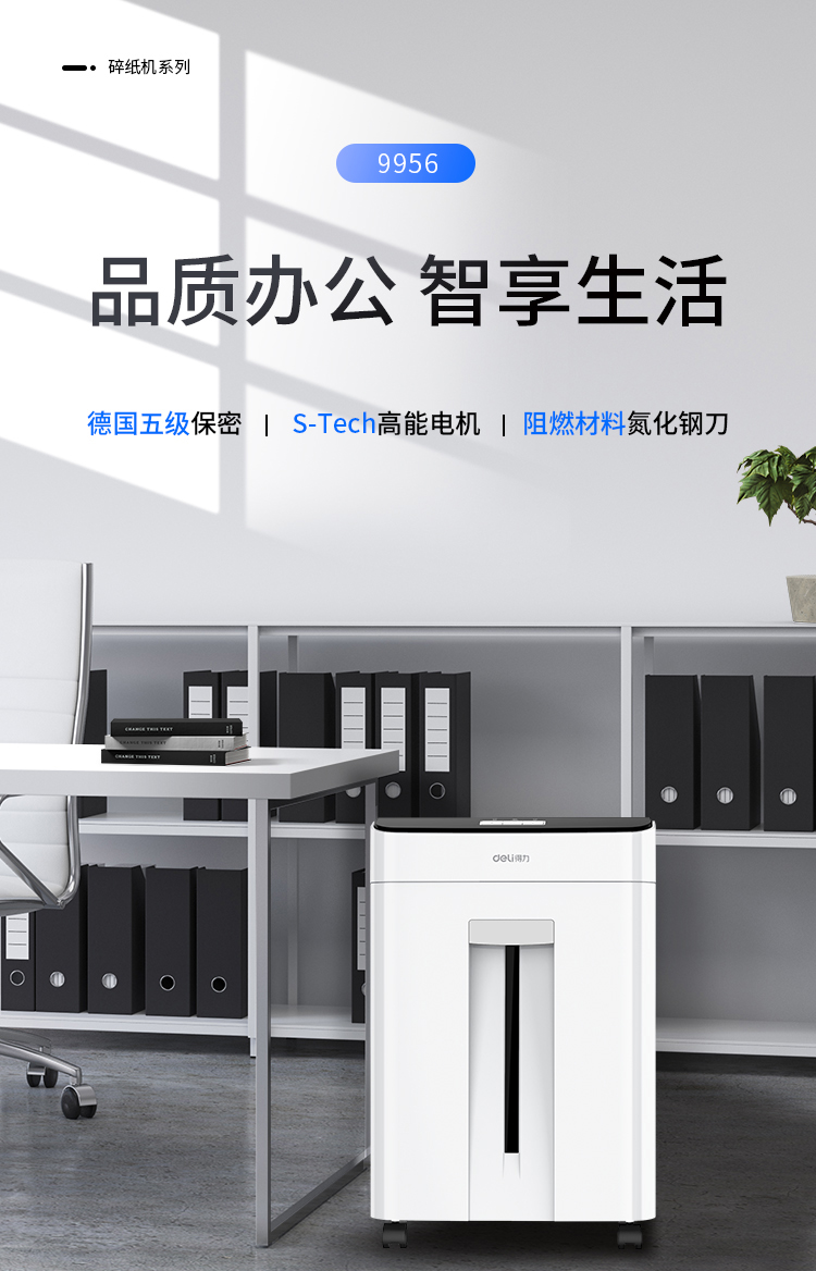 商品名称:得力9956碎纸机 5级保密 单次可碎8张 连续碎纸20分钟 最大碎纸幅面A4 容量23L 可碎卡、光盘 单位:台