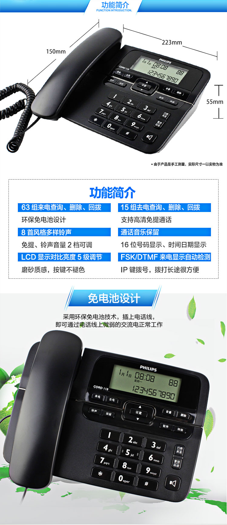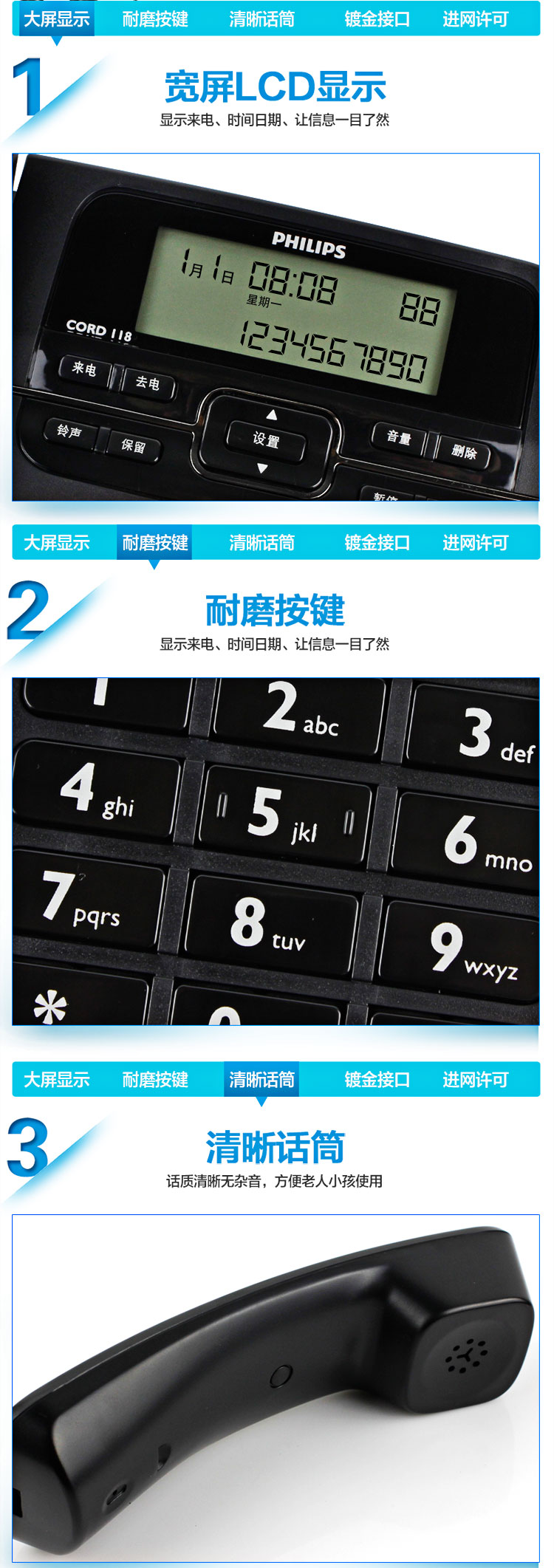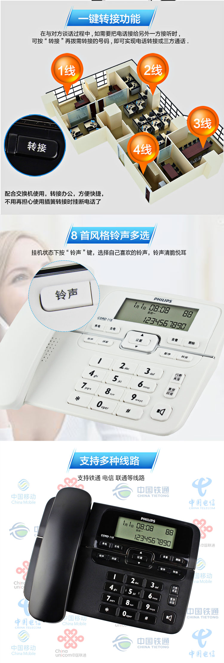 商品名称:飞利浦CORD118双接口免提家用电话机 白色