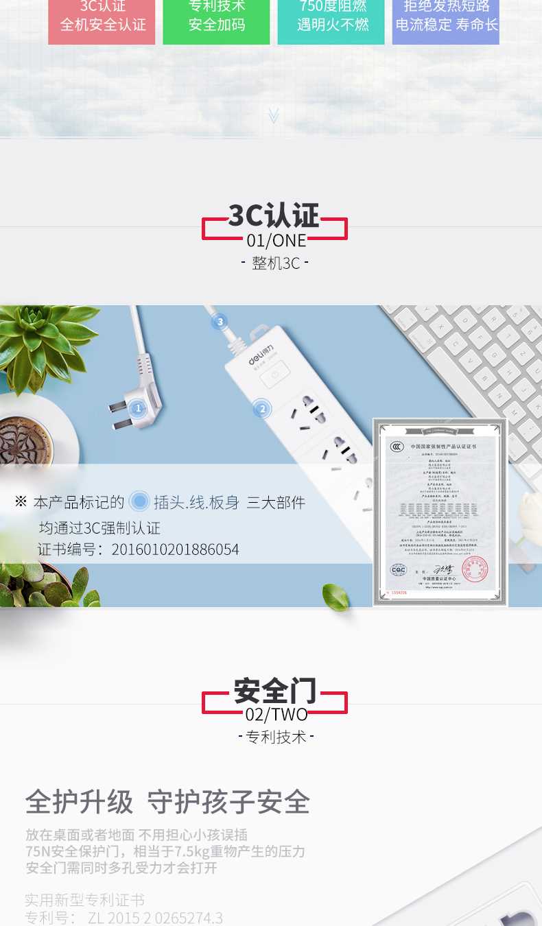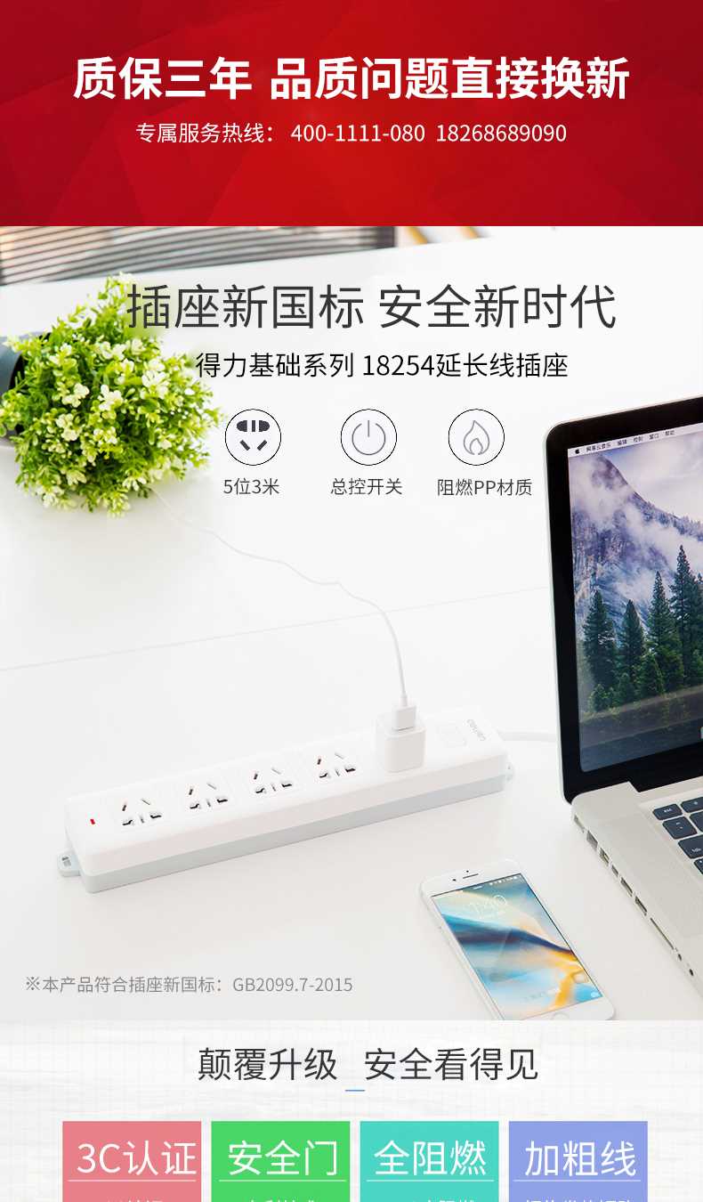 商品名称:得力(deli)18254 新国标5位组合孔3米 总控开关插座/插排/插线板/接线板/排插/拖线板
