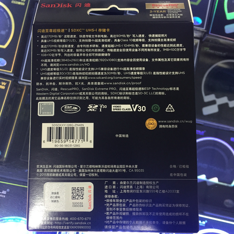商品名称:闪迪SanDisk128GB 读速170MB/s至尊超极速SDXC UHS-I存储卡 V30 U