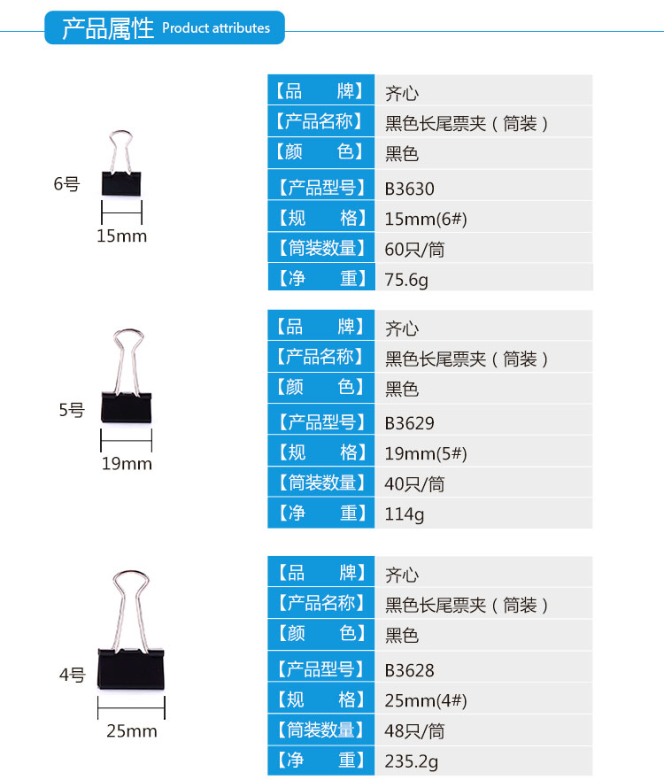 商品名称:齐心(COMIX)B3625 12只50mm黑色长尾票夹 金属票据夹燕尾夹铁夹子 大号