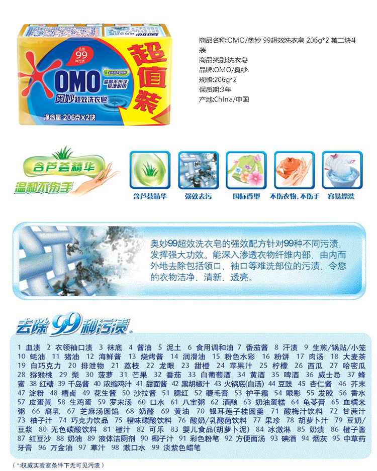 商品名称:奥妙99超效洗衣皂透明皂206g*2块去除污渍超值装