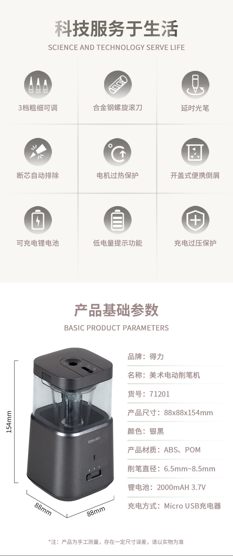 商品名称:得力71201美术全自动削铅笔机 电动素描卷笔刀铅笔机 美术生专用 USB充电款 71201