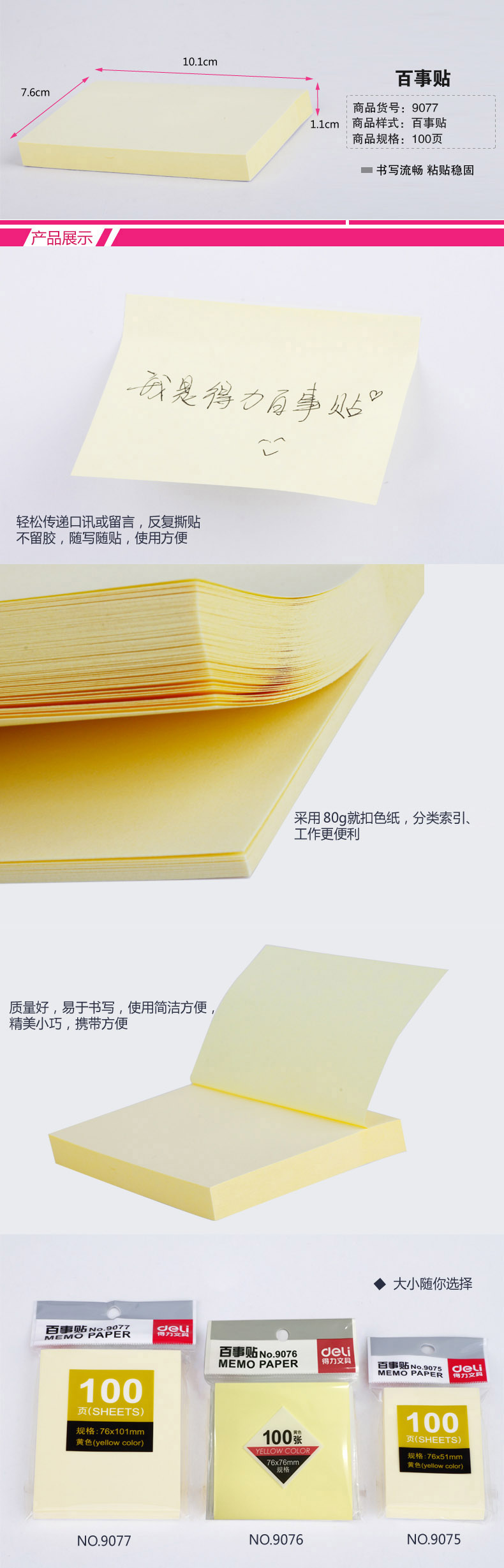 商品名称:得力9076可撕便签本 黄色 76*76mm(包)