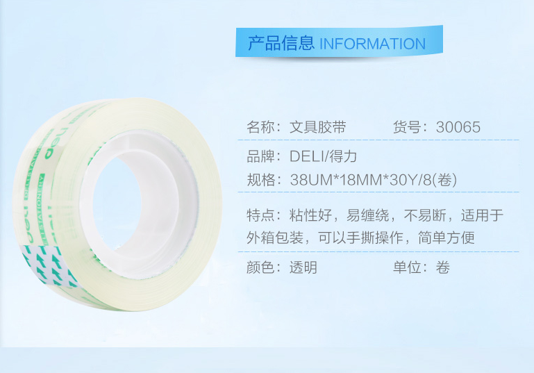 商品名称:得力(deli) 30065文具胶/1.8cm透明胶带/小胶带(1.8cm×30y)胶条 8卷/筒 单位:筒