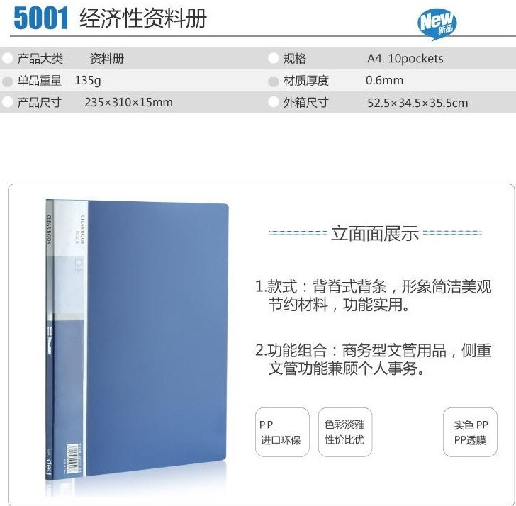 商品名称:得力 (deli)5001 10页资料册文件夹插页袋A4多层分页透明卷子夹活页办公用品 蓝色