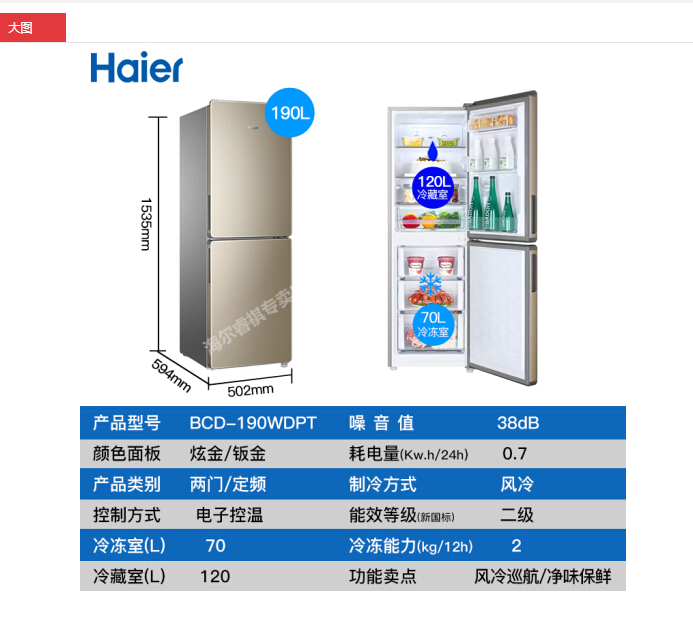 商品名称:海尔双门两门小冰箱风冷无霜/直冷小型家用家电迷你节能电冰箱 190升双门两门无霜冰箱BCD-190WDPT