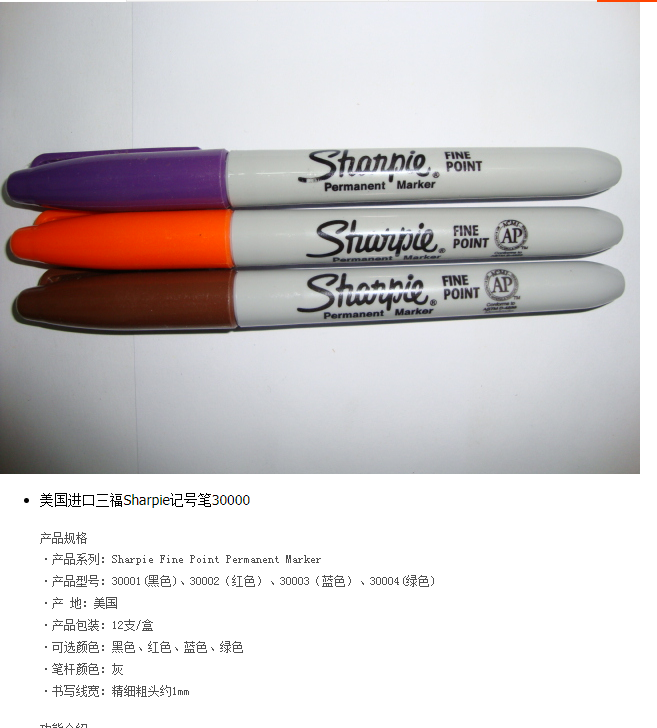 商品名称:美国Sharpie三福油性笔 三福无尘记号笔 三福标记笔 30000系列(黑色)