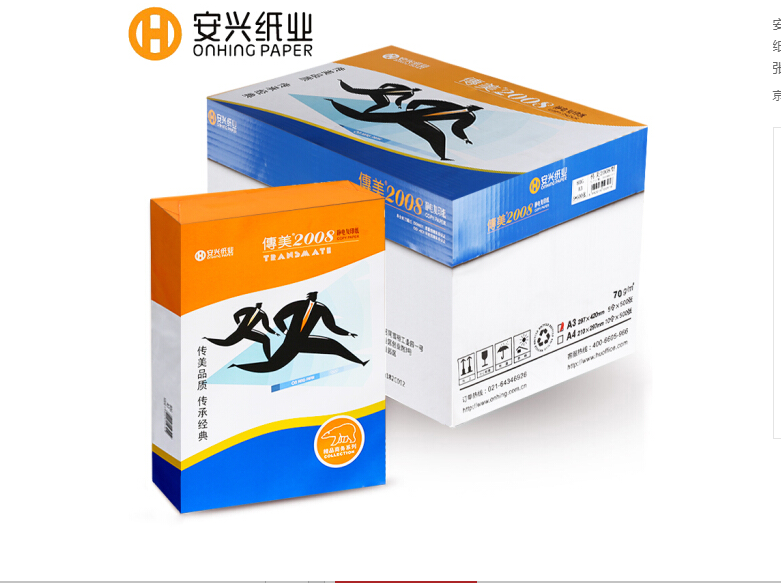 商品名称:安兴纸业 传美2008 80g A3 复印纸 500张/包 5包/箱