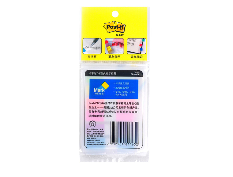 商品名称:3M 683-6CF 6色 |透明指示标签|彩色便利贴/便签纸/报事贴 36包/盒