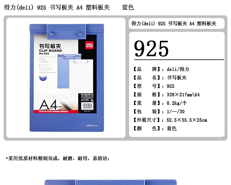 商品名称:得力925塑料书写板夹(蓝)(只)