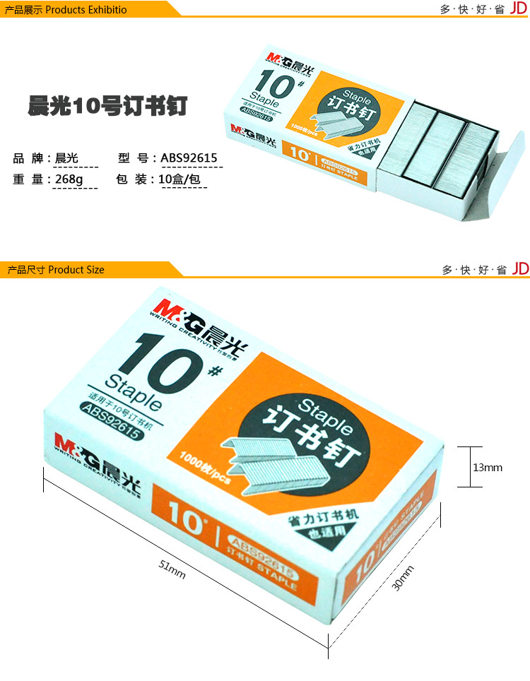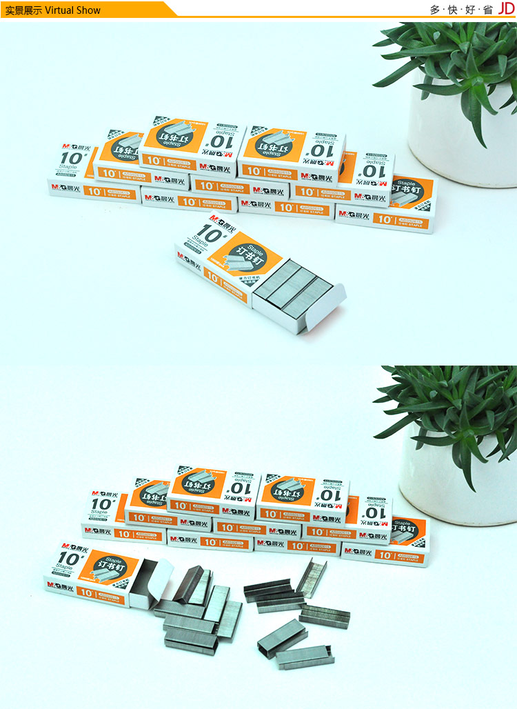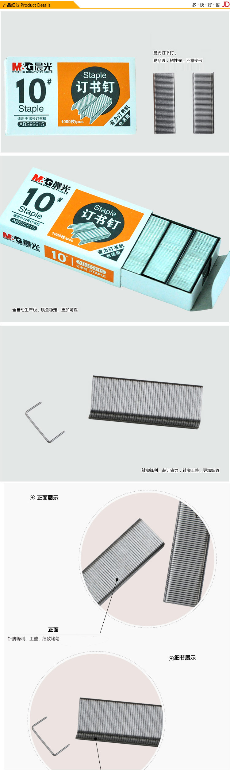 防锈处理 ,质量稳定,不易腐蚀,尖头针脚,穿透力更强,针脚锋利,装订精准,省力订书机也可适用,小盒装携带方便,使用便捷。